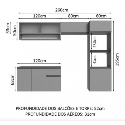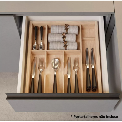 Focused on durability, the furniture consists of high quality materials. It has aluminum handles in Titanium color, telescopic slides for full drawer opening, metal hinges on the doors and glass in the air dotted in the air.
